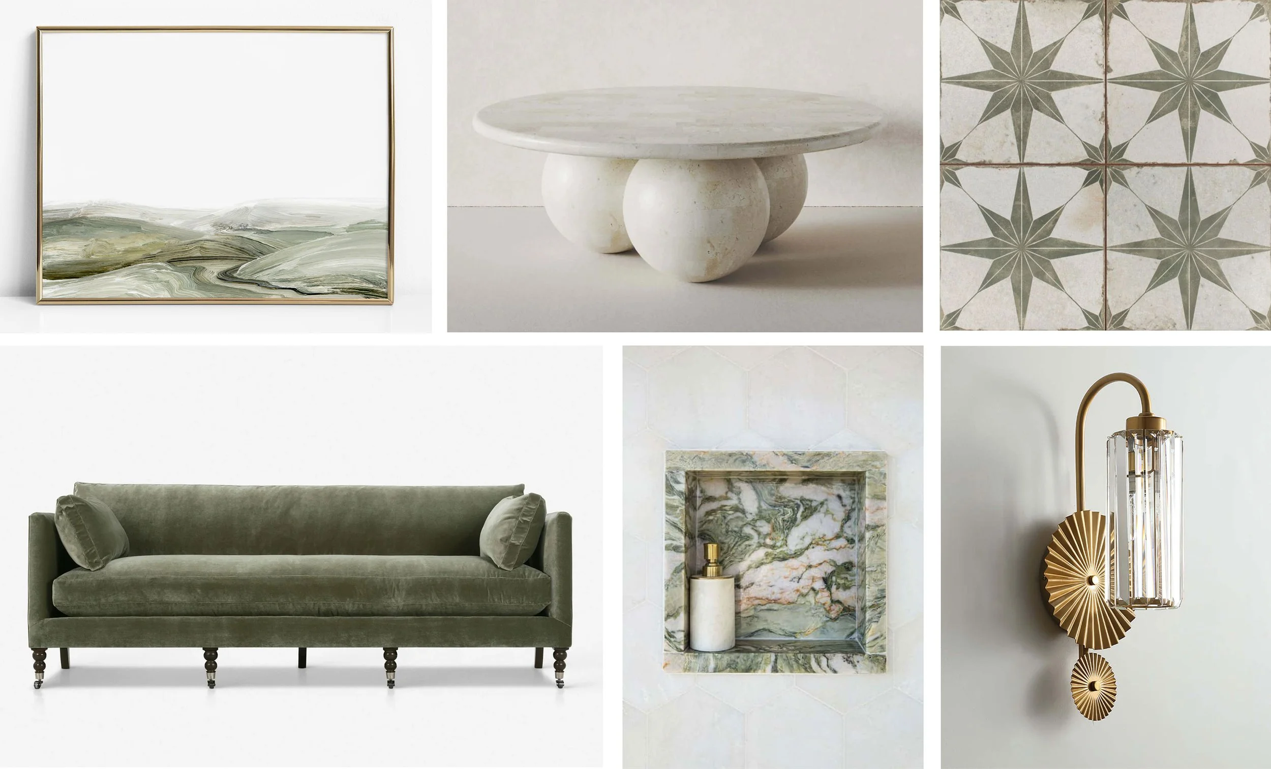 I love interior spaces that incorporate this soothing sage color. Pairing sage with brass lighting and thin golden picture frames adds a touch of opulence to a living space. I find that less is more with gold finishes. Simple large furniture like this velvet sofa and natural stone coffee table evoke a sense of luxury and refinement.